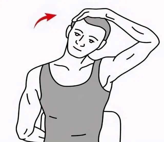 单手斜抱头顶,缓慢向左或右拉伸脖颈。注意切勿太过用力。